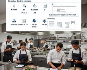 Cursos Online Exclusivos: Treinamento escalável para toda a sua equipe, desde gerentes a auxiliares. Incluímos módulos completos de Kaizen, 5S, Kanban, JIT, PDCA, OKRs, Fichas Técnicas no Excel e o poderoso Plano de Desenvolvimento Individual (PDI). Seus colaboradores crescem, seu negócio prospera!