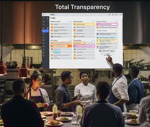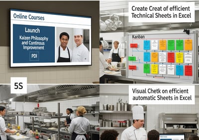 Kanban (gestão visual de tarefas) na cozinha. Treinamos sua equipe na criação de Fichas Técnicas eficientes e automáticas no Excel.